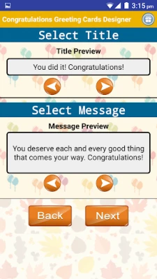 Congratulations Wishes Greeting Cards Designer is a Free app that allows you to Design & Share beautiful Congrats Greeting Cards & wishes and send to your loved ones in 3 easy steps from our Free Card Templates as easy as: